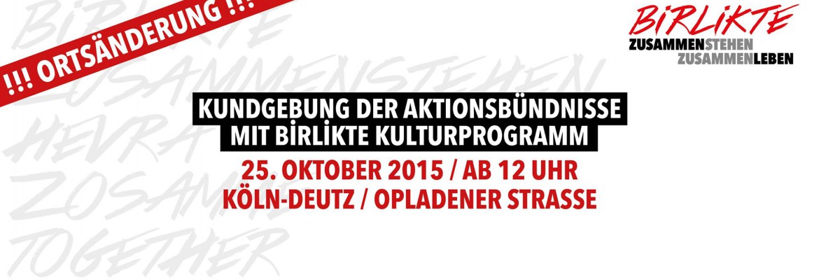 Nachdem den Initiatoren der HoGeSa-Demo eine Standkundgebung am Barmer Platz erlaubt wurde, hat auch das Birlikte-Bündnis sich dazu entschlossen, vom Eigelstein mit ins Rechtsrheinische zu ziehen, um gemeinsam mit den Kölner Bürger/Innen ein deutliches Zeichen zu setzen! Die Kundgebung mit Wortbeiträgen und Musik von BIRLIKTE wird an diesem Sonntag in Köln-Deutz am Deutzer Bahnhof (Opladener Str.) ab 11:45 h stattfinden.